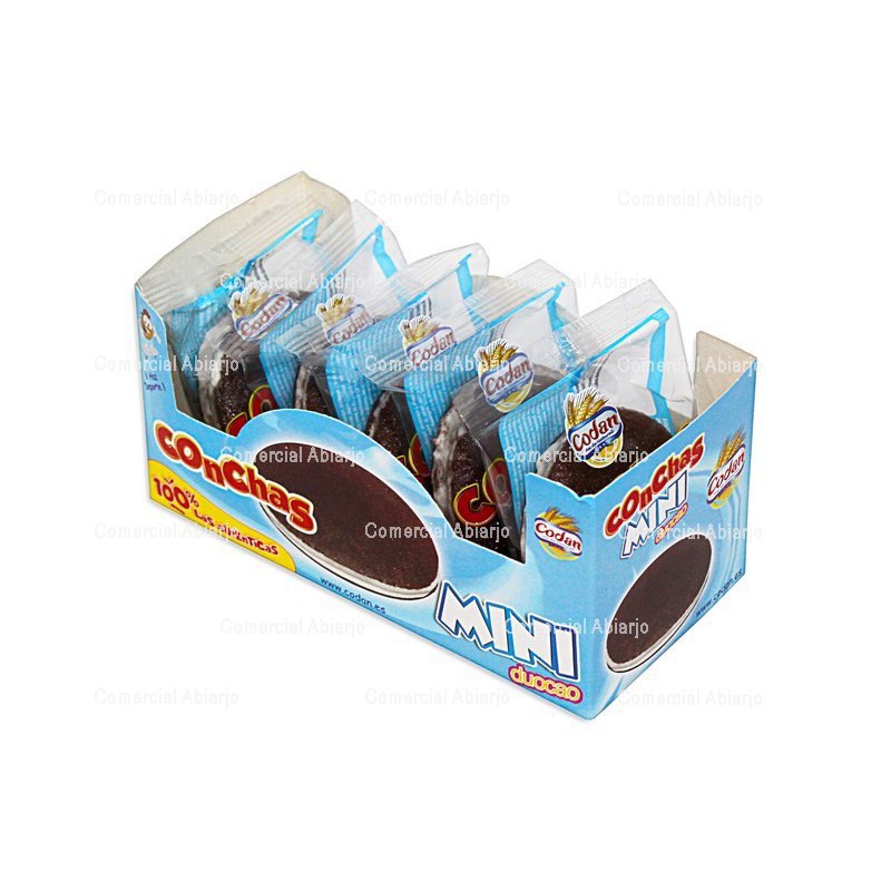 MINI CONCHAS DUOCAO. PRODUCTO DE PASTELERÍA Y REPOSTERÍA. BIZCOCHO DE CACAO REDONDO RELLENO DE PRODUCTO DE CONFITERÍA BLANCO.