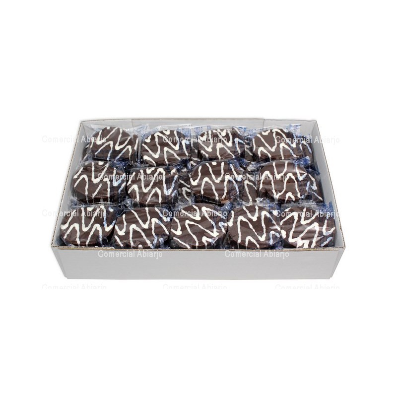DIANAS CACAO. PRODUCTO DE PASTELERÍA, AMASADO Y HORNEADO, GUARNECIDO, LIADO, CORTADO Y BAÑADO CON COBERTURA NEGRA Y DECORADO CON TRAZAS DE COBERTURA BLANCA.